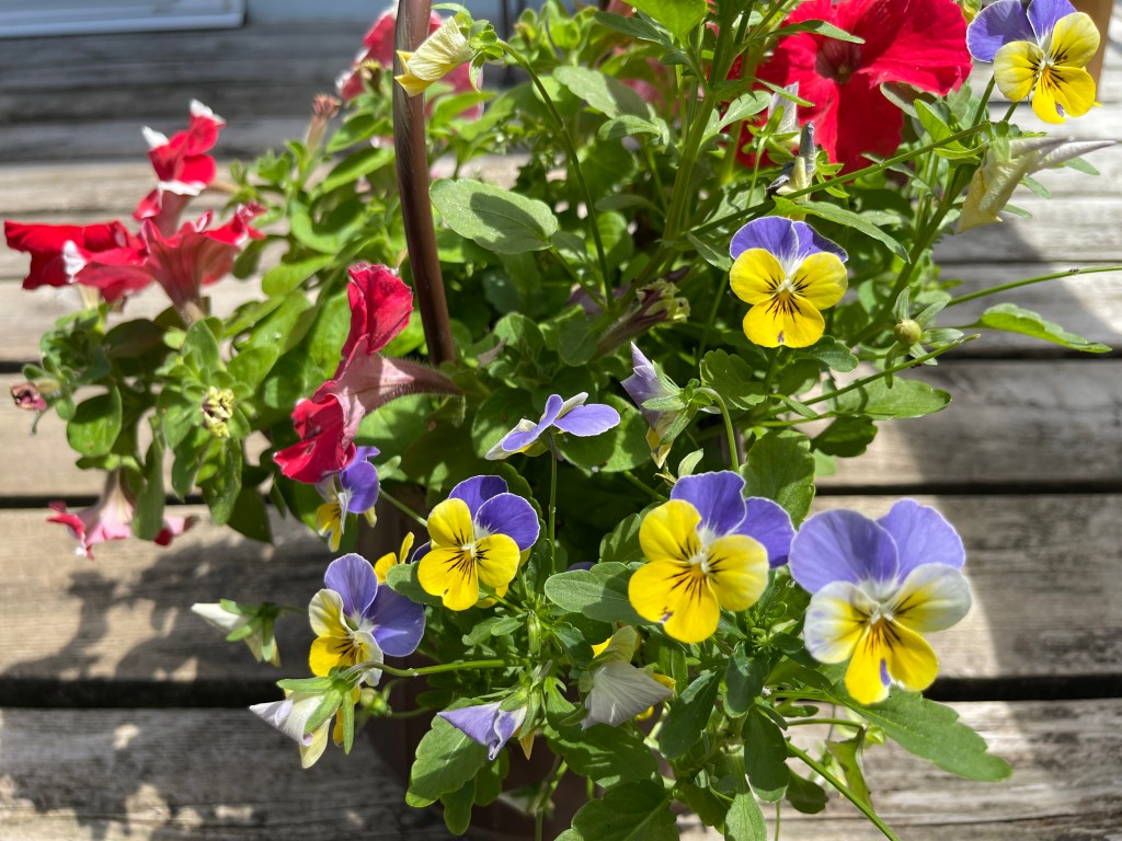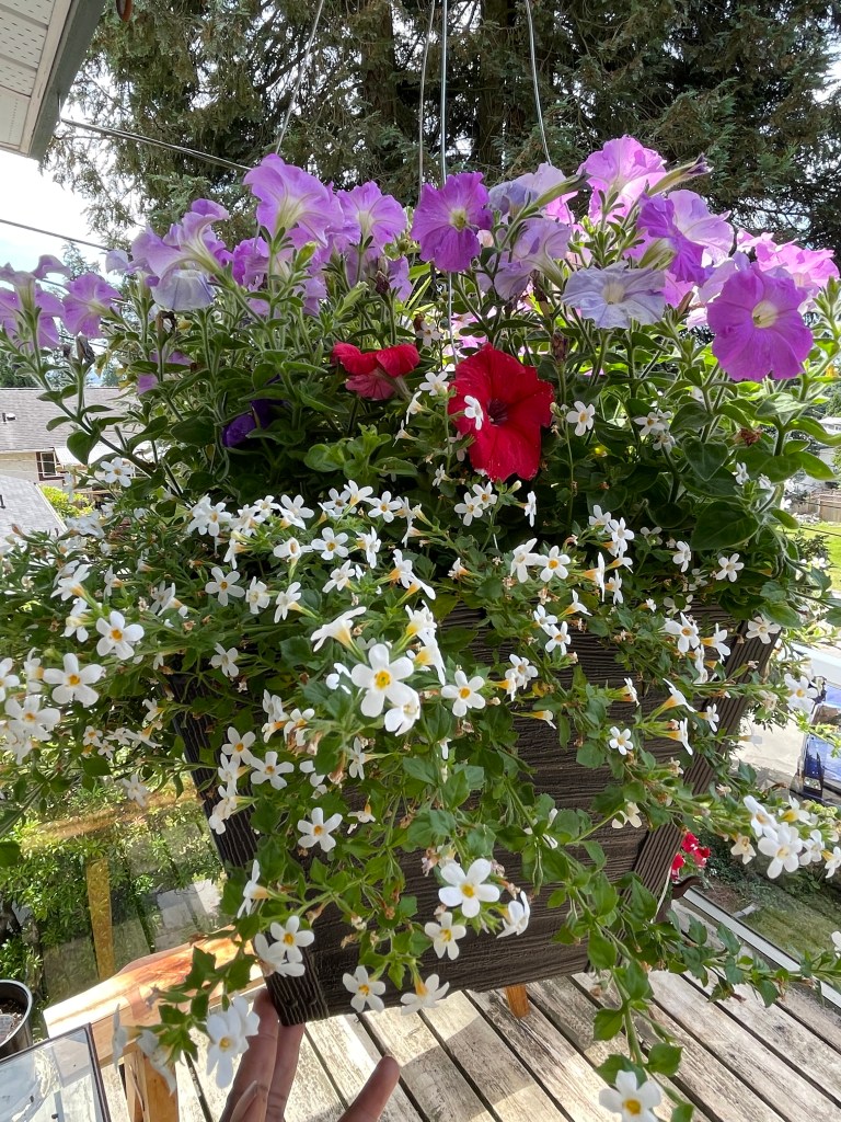 Petunias and Violas are a staple in every summer garden, easy to grow and provides a great show all season. I also love creating my own hanging baskets, They are a little eclectic but are well suited to my taste and personality.
